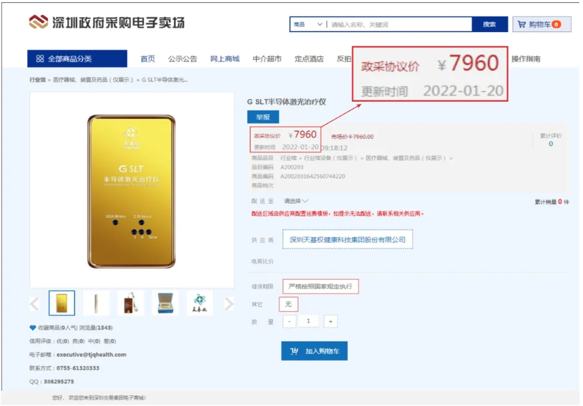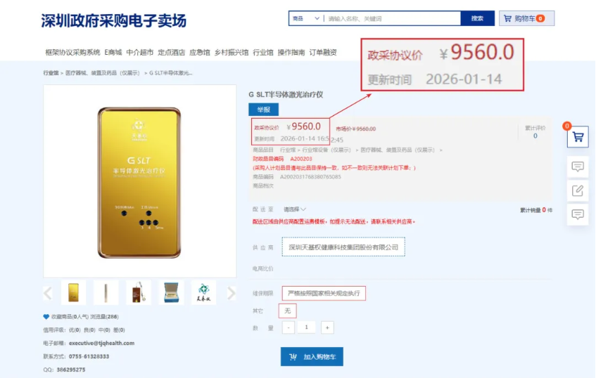 Recently, the Shenzhen Government Procurement Electronic Marketplace announced the adjustment of the government-guided price for the Tianji Quan G SLT Semiconductor Laser Therapy Device, increasing the guided price from the original 7,960 yuan to 9,560 yuan.